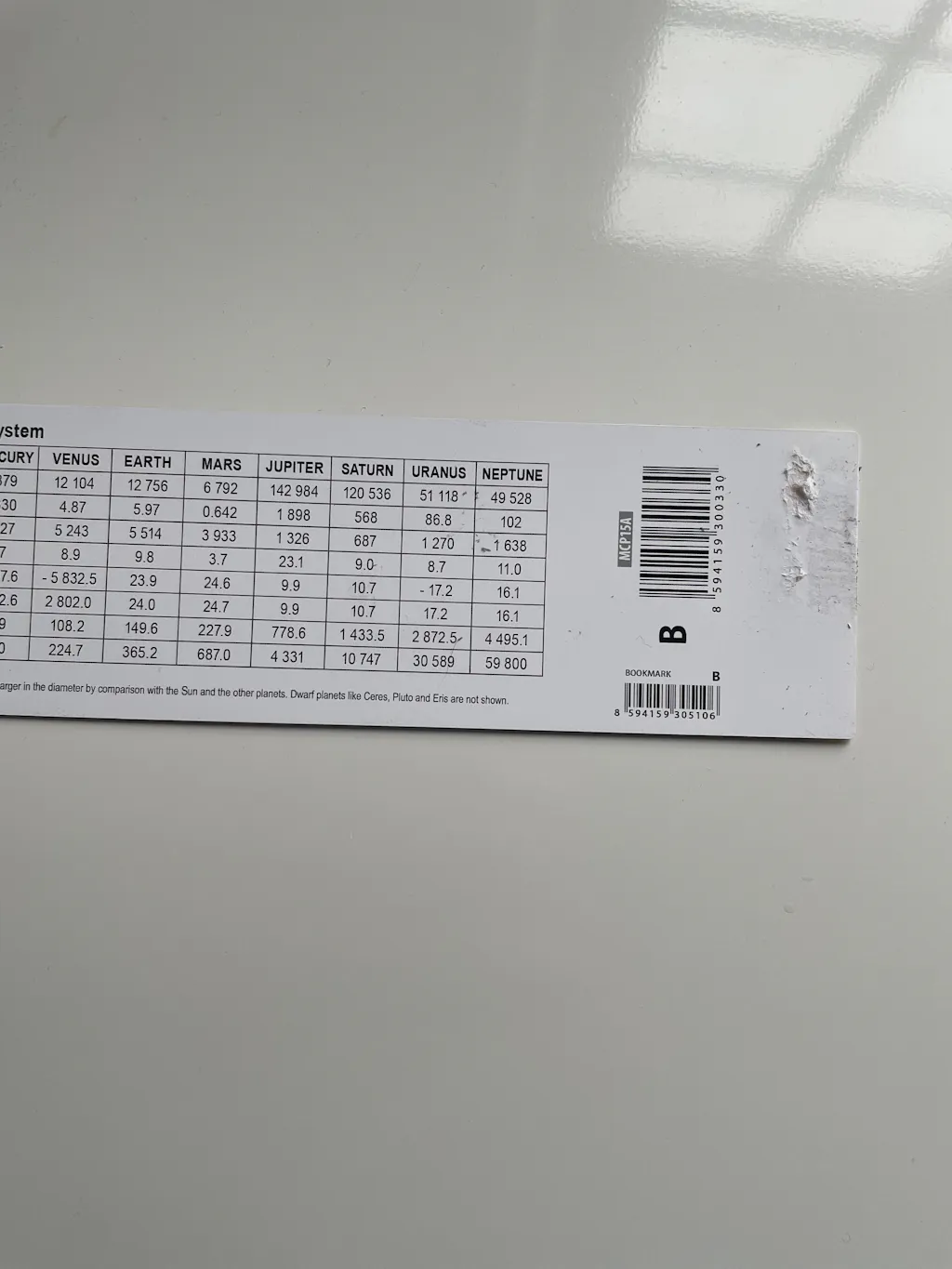 The back of the bookmark shows detailed information of the planets of our solar system, their diameter to the equator, mass, density and much more!