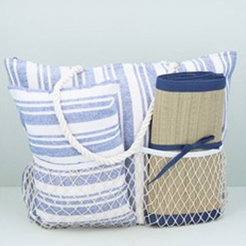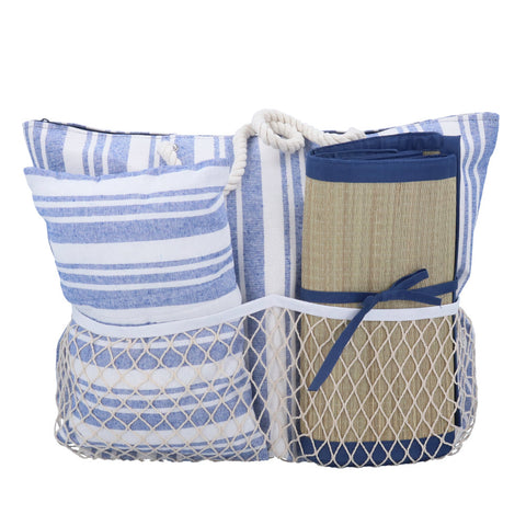 Blue Striped Beach Bag, Pillow and Beach Mat Set