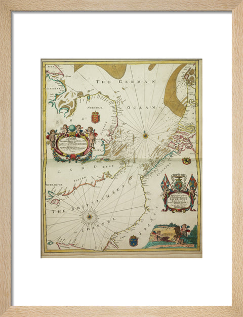 A new mappe of the sea coasts of England, France and Holland, wherein the English names, situation, point of the compass, and distance of the several ports, harbours, havens, creeks, sands.' A chart from 'Atlas Maritimus', or the Sea Atlas; being a book of maritime charts. John Seller was Hydrographer to King Charles II. North at 349 degrees. Borders graduated for latitude. Bar scales in English, French and Dutch miles. Contains a dedication to James, Duke of York, in a cartouche decorated with his arms. Title and scale cartouches decorated with surveying putti.