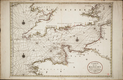 A Mercator chart of the English Channel and the Atlantic coasts of southern Britain and northern France. Inscribed 'Carte de la Manche faite par ordre du Roy pour le service des armees de mer. Revuee et corrigee par le Sr.Sanson a Paris chez Hubert Jaillot 1692.' This chart was included in Jaillot's, Le Neptune Francois, published in 1693.
