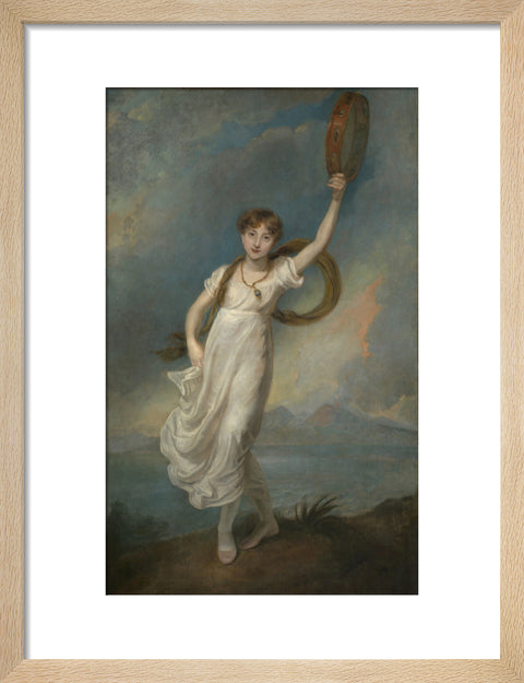 A full-length portrait of Nelson's daughter, full-face, wearing a white dress, red pumps and a miniature of her father around her neck. She is dancing in a rocky foreground with an imaginary landscape in the distance, a tambourine held high in her left hand and her gaze directly engaging the viewer. The coastal scene with mountains and smoke from a volcano on the right, may be intended to represent the Bay of Naples by an artist who had never visited it. This painting is part of the Nelson-Ward Collection, presented to the National Maritime Museum by Horatia's grandson the Revd Hugh Nelson-Ward in 1946.