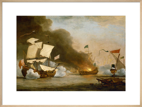 An action between an English two-decker and a Barbary two-decker, showing three small ships and four galleys. Although naval historians are unable to relate the action to a specific event, the painting significantly identifies the danger to English ships from such pirates during the 1660s and 70s and was initially thought to show the 'Kingfisher' in action in 1681.