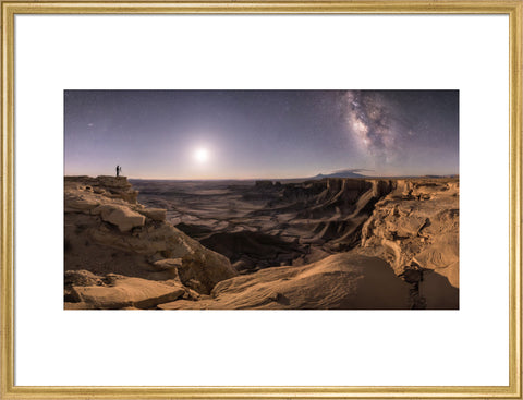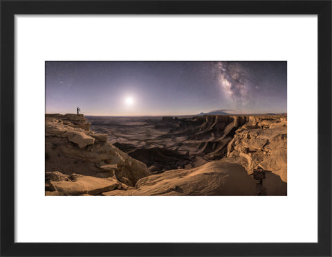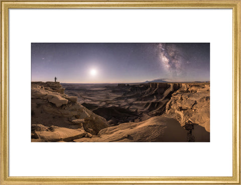 "Once the quarter Moon rose, it revealed the incredible, vast landscape of the shale hills below our viewpoint. The lone photographer and friend to the left of the frame stood motionless while I captured the photograph. The Andromeda Galaxy, quarter Moon, Milky Way galaxy, and position of the photographer all combined to create a captivating, harmonious portrait of a night-sky photographer at work." Brad Goldpaint 2018