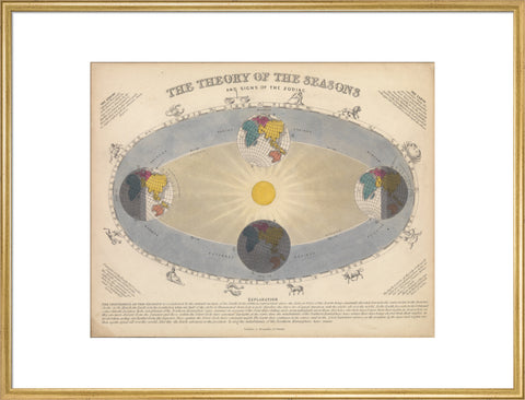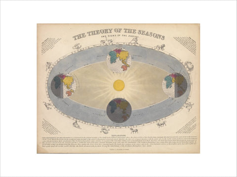 One of a set of twelve hand-tinted astronomical prints with an explanatory card. These cards were first issued by Reynolds in 1846, although he and other publishers continued to produce them throughout the second half of the 19th century. They responded to a perceived market for popular science products and were intended for informal learning within the home. The main diagram shows the Earth's annual rotation around the Sun, surrounded by a zodiacal scale that gives the names, symbols and images of the signs of the zodiac. The seasons and the positions of the equinoxes and solstices are marked. Text at the corners describes the Zodiac and the Earth, and a longer text at the bottom explains the Phenomena of the Seasons.